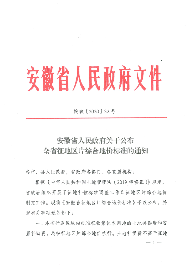 安徽省人民政府关于公布全省征地区片综合地价标准的通知(皖政〔2020〕32号)