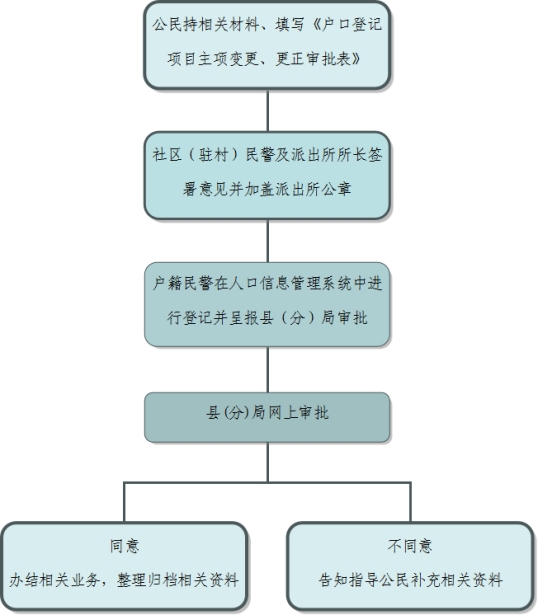 (一)公民持相关材料,到户籍地派出所填写《户口登记项目主项变更、更正审批表》,由社区(驻村)民警及派出所所长签署意见并加盖派出所公章,同时,户籍民警要在人口信息系统进行登记,扫描电子资料后,报分县局审批。