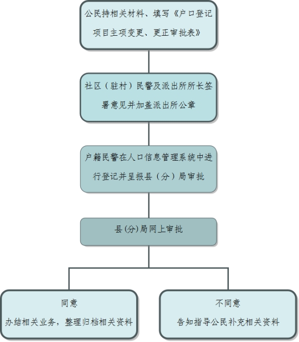 (一)公民持相关材料,到户籍地派出所填写《户口登记项目主项变更、更正审批表》,由社区(驻村)民警及派出所所长签署意见并加盖派出所公章,同时,户籍民警要在人口信息系统进行登记,扫描电子资料后,报分县局审批。