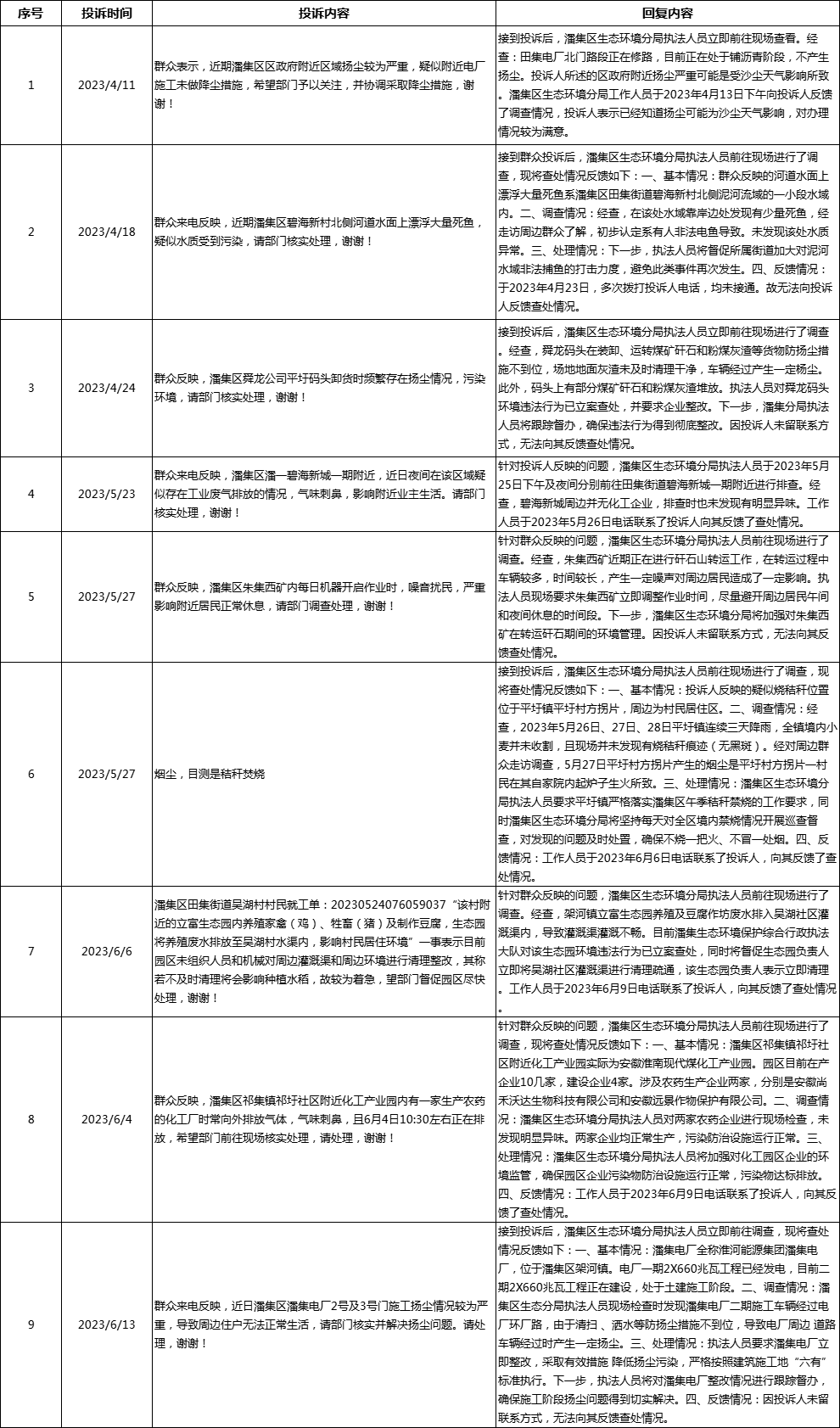 潘集区生态环境分局2023年4月——2023年6月信访件处理情况明细表