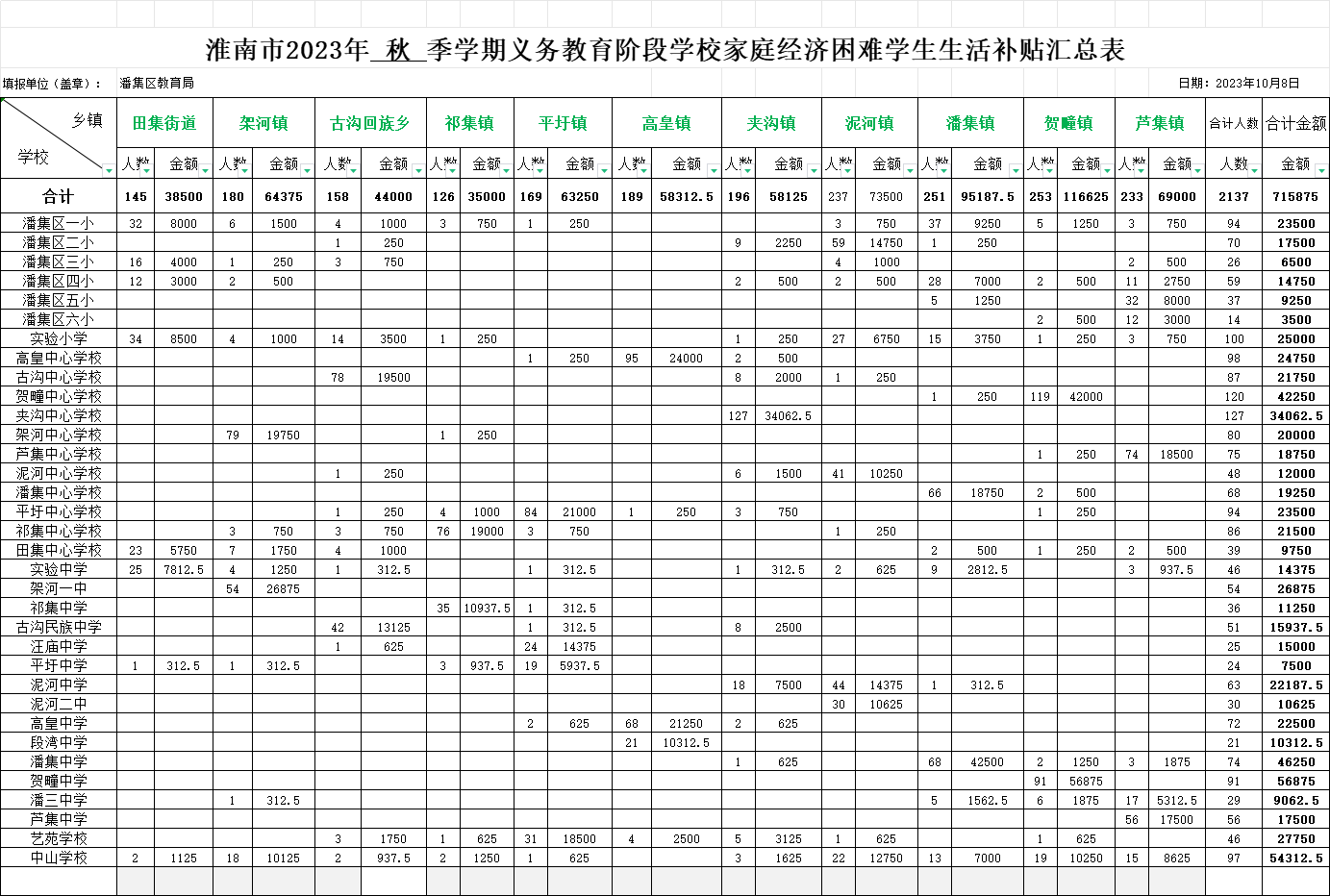 2023年秋义务教育阶段家庭经济困难学生生活补贴汇总表