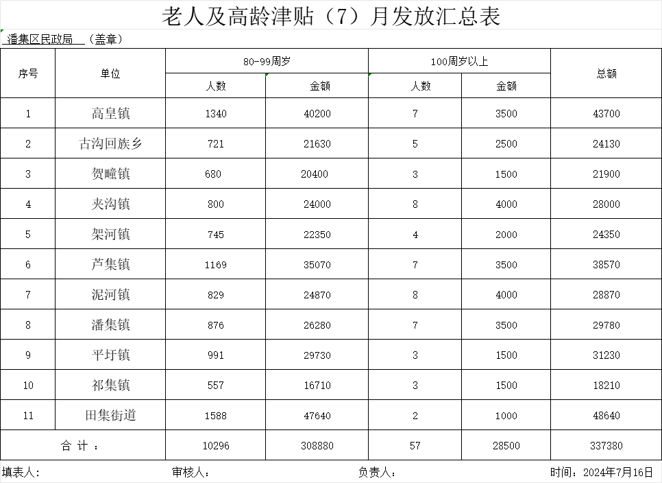 (老年人补贴)老人及高龄津贴2024年7月发放情况