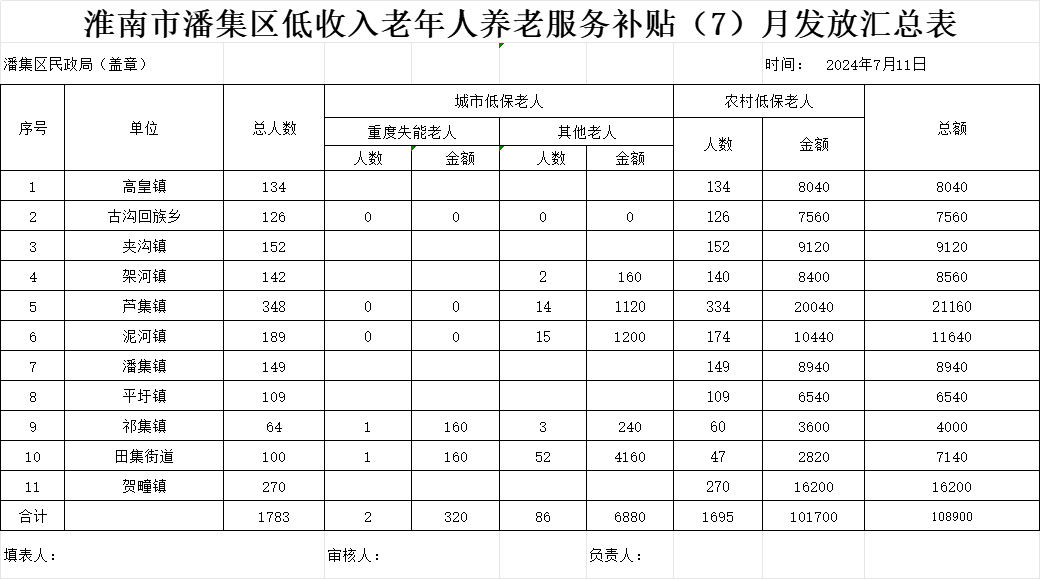 2024年7月潘集区低收入老年人养老服务补贴发放汇总表