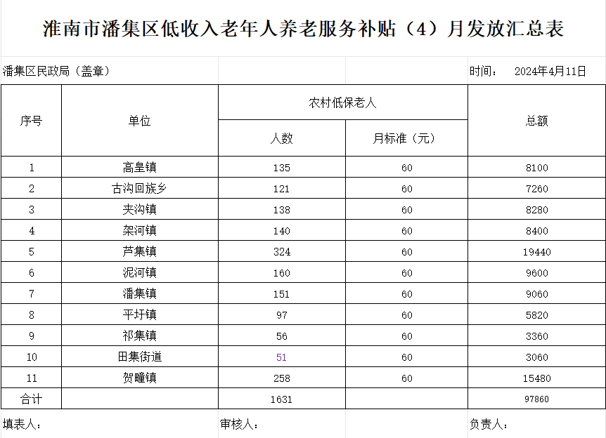 2024年4月潘集区低收入老年人养老服务补贴发放汇总表