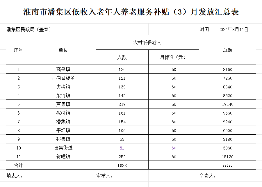 2024年3月潘集区低收入老年人养老服务补贴发放汇总表