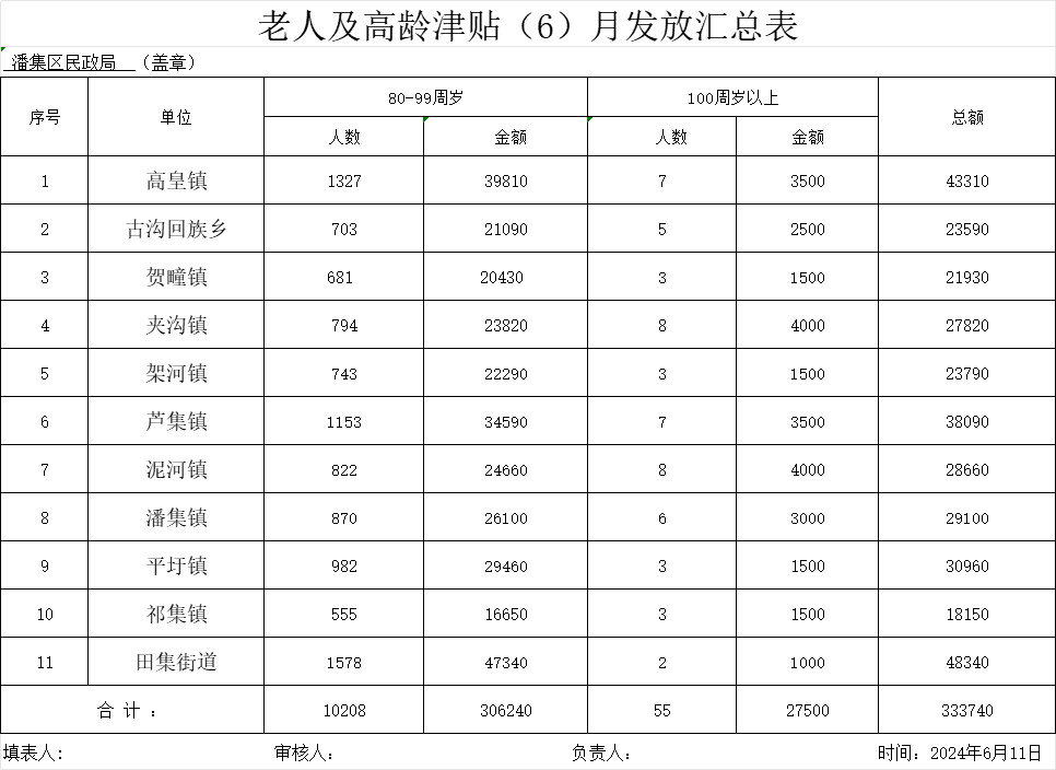 (老年人补贴)老人及高龄津贴2024年6月发放情况