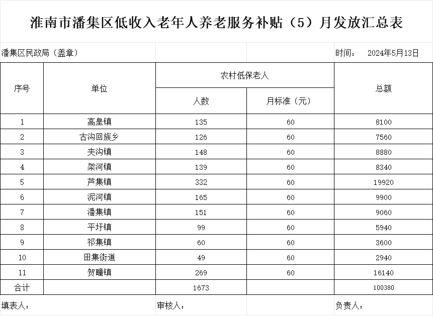 2024年5月潘集区低收入老年人养老服务补贴发放汇总表