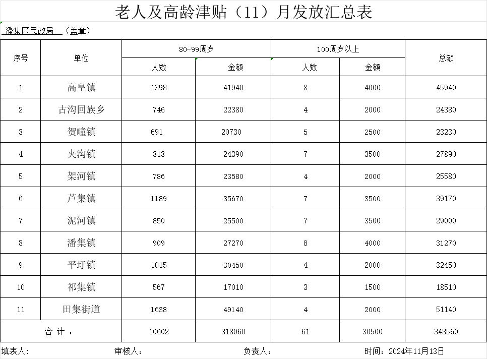 (老年人补贴)老人及高龄津贴2024年11月发放情况