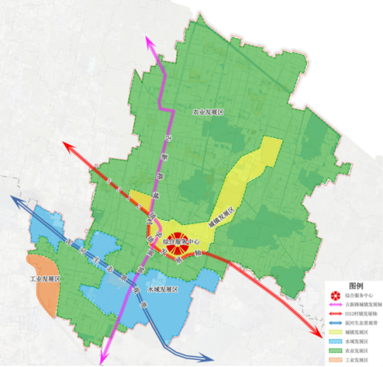 两轴:两条综合发展轴。依托南北向县道古新路,形成以商业服务为特色的综合发展主轴;依托东西向县道015,形成以公共服务为特色的综合发展次轴。