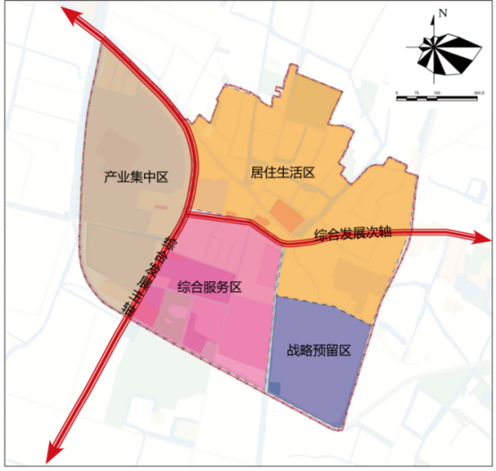 四区:位于镇域中部的城镇发展区、位于镇域南部的水域发展区、位于镇域北部的农业发展区、位于镇域西南部的工业发展区。