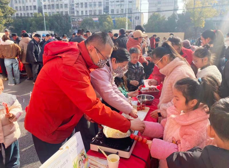 活动现场,非遗展区与农产品展销区相映成趣、人气旺盛。泥老虎制作技艺非遗传承人现场教学,市民沉浸式感受传统手工艺魅力;剪纸、糖葫芦等手工摊位前,家长与孩子携手创作,在互动中传承民俗乐趣。书画志愿者挥毫泼墨,免费书写春联、赠送福字,将新春祝福送到群众手中。