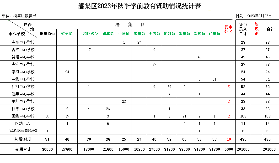 2023年秋学前教育资助统计表
