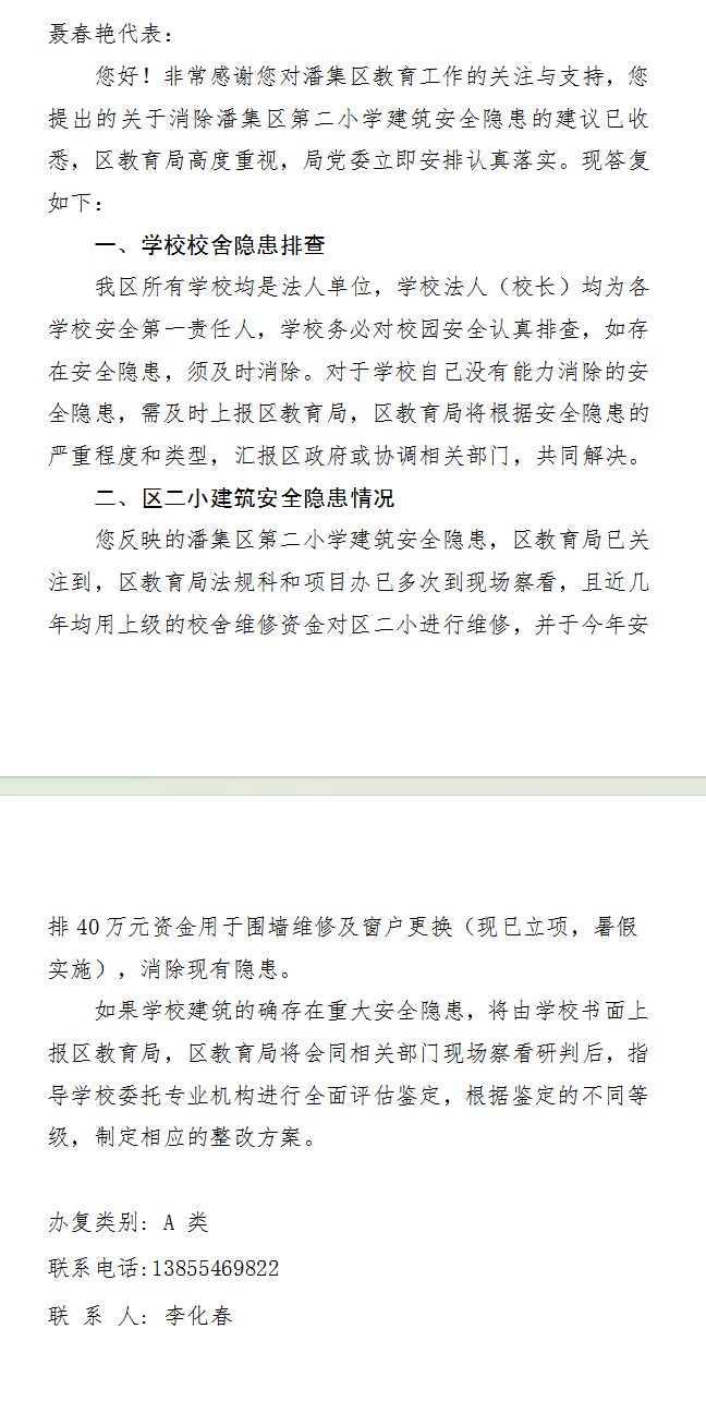 关于消除潘集区第二小学建筑安全隐患建议的答复