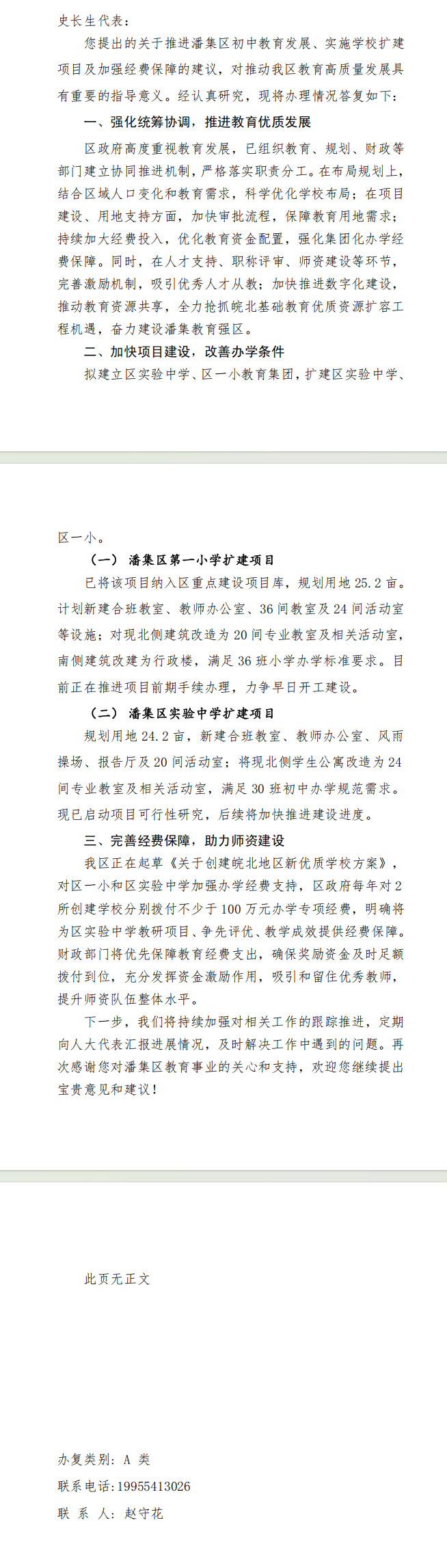 关于在“皖北扩容工程”背景下,打造潘集区初中教育新图景的建议的回复