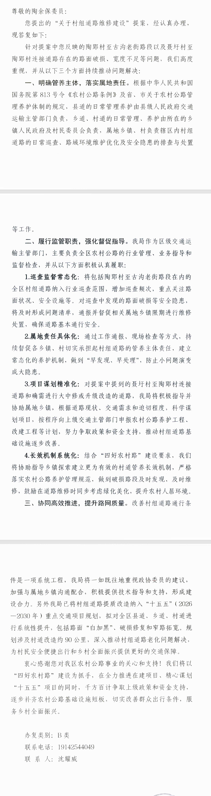 关于区第十届政协第四次会议“关于村组道路维修建设”提案的答复函