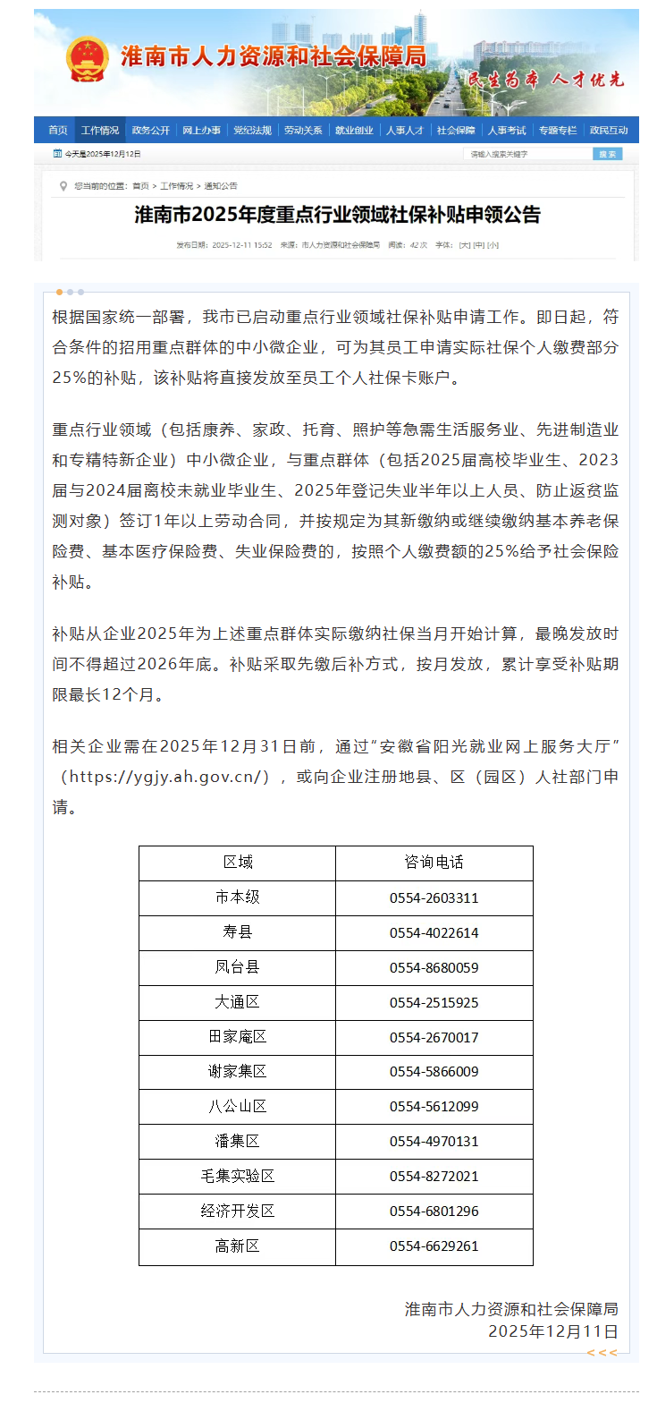 【社保补贴】淮南市2025年度重点行业领域社保补贴申领公告