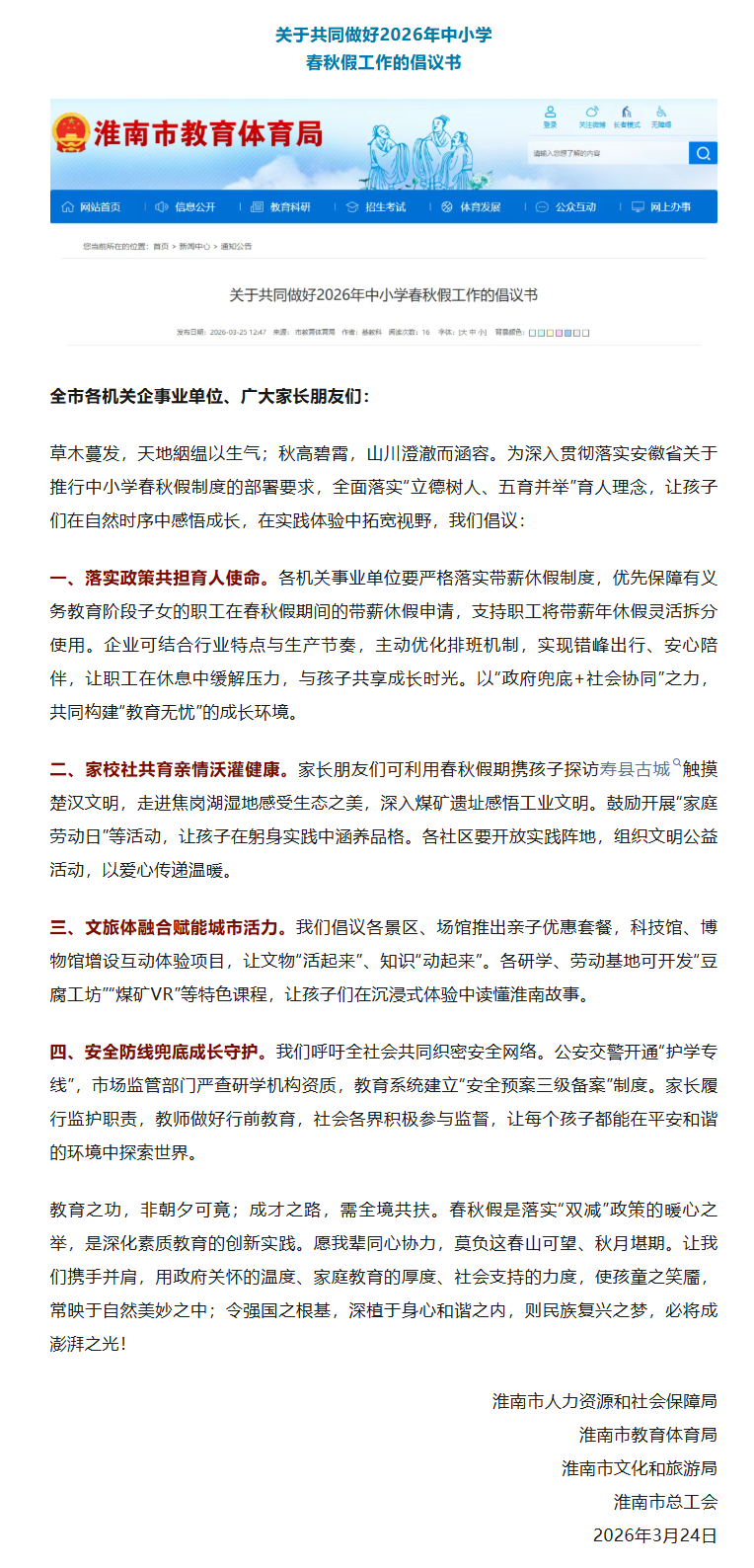 【教育信息】最新倡议!事关淮南中小学春秋假