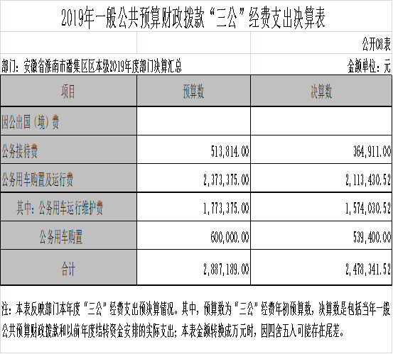 2019年,我区从严从紧控制“三公经费”支出,确保“三公经费”只减不增,大力压减一般性支出,把有限财政资金用于脱贫攻坚和改善民生上。2019年全区共安排“三公经费”支出247.83万元,占年初预算的86%。其中:公车购置和运行维护费211.34万元,占年初预算的89%;公务接待费36.49万元,占年初预算的71%;无公务出国(境)费。