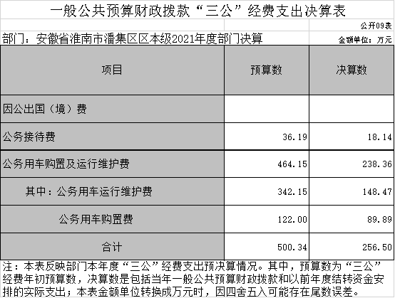 2021年,我区从严从紧控制“三公经费”支出,大力压减一般性支出。2021年区本级共安排“三公经费”支出预算数500.34万元,决算数256.5万元,占年初预算的51%。其中:公车购置和运行维护费预算数464.15万元,决算数238.36万元,占年初预算的51%;公务接待费预算数36.19万元,决算数18.14万元,占年初预算的50%;2021年度无公务出国(境)费。(见附表)