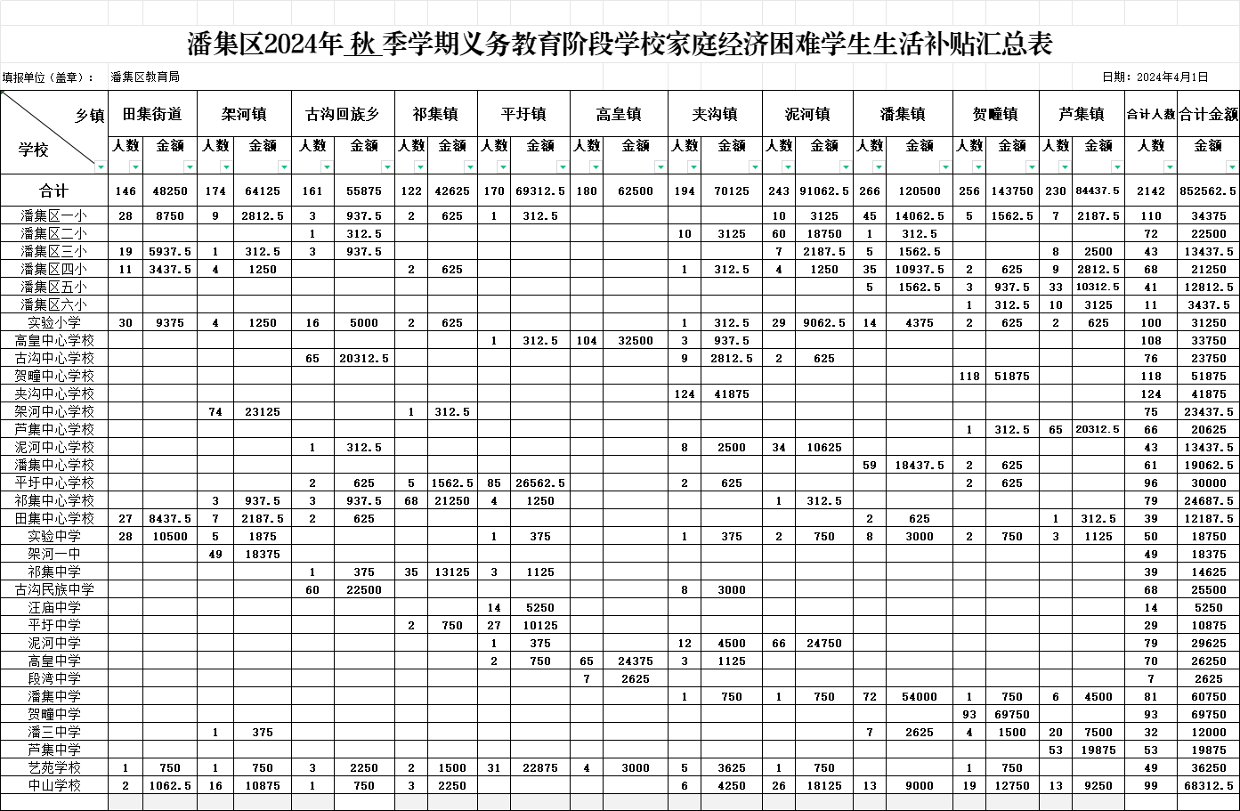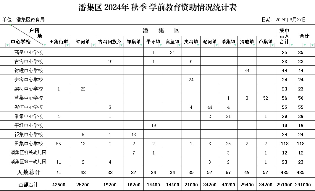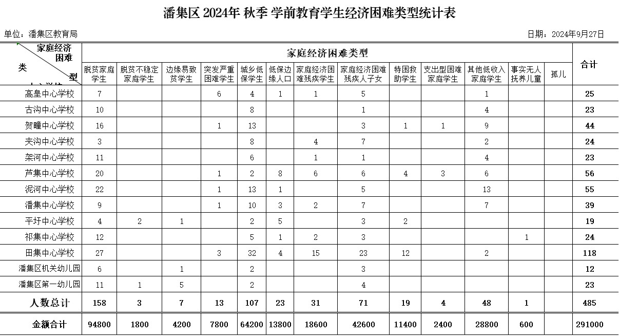 潘集区2024年学前及义务教育阶段,家庭经济困难学生统计表,及拟资助统计表,数字一致,应助尽助
