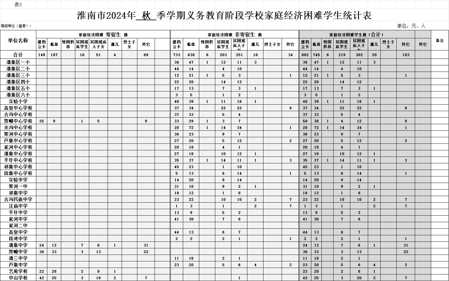 潘集区2024年学前及义务教育阶段家庭经济困难学生统计表及拟资助统计表