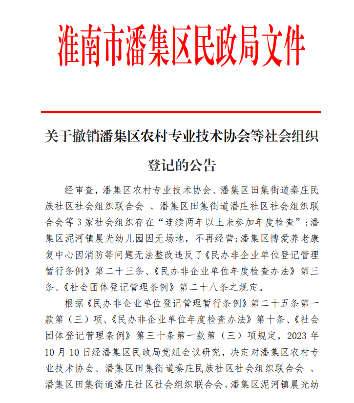 关于撤销潘集区农村专业技术协会等3家社会组织登记的公告