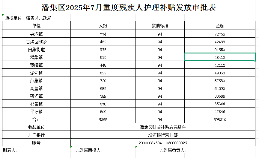 潘集区2025年7月份重度残疾人护理补贴发放审批表