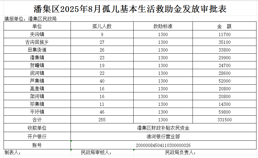 潘集区2025年8月孤儿基本生活救助金发放审批表