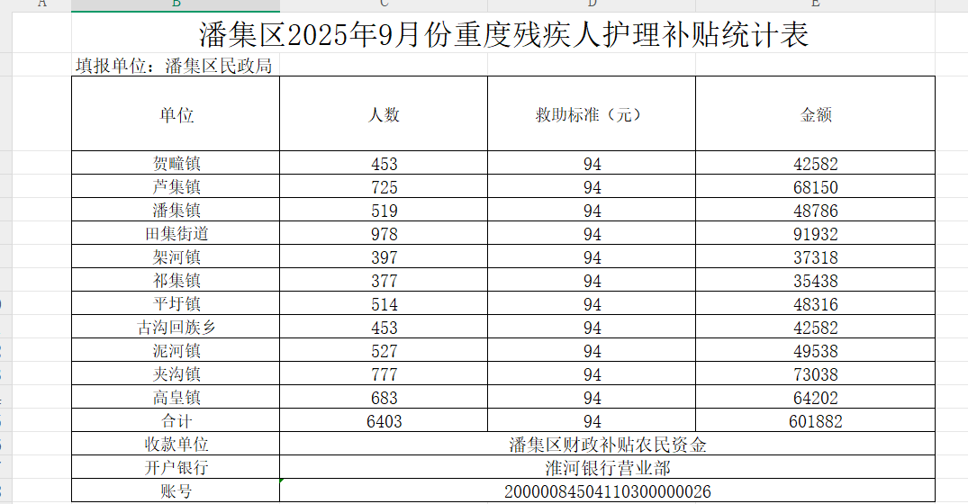 潘集区2025年9月份重度残疾人护理补贴发放审批表