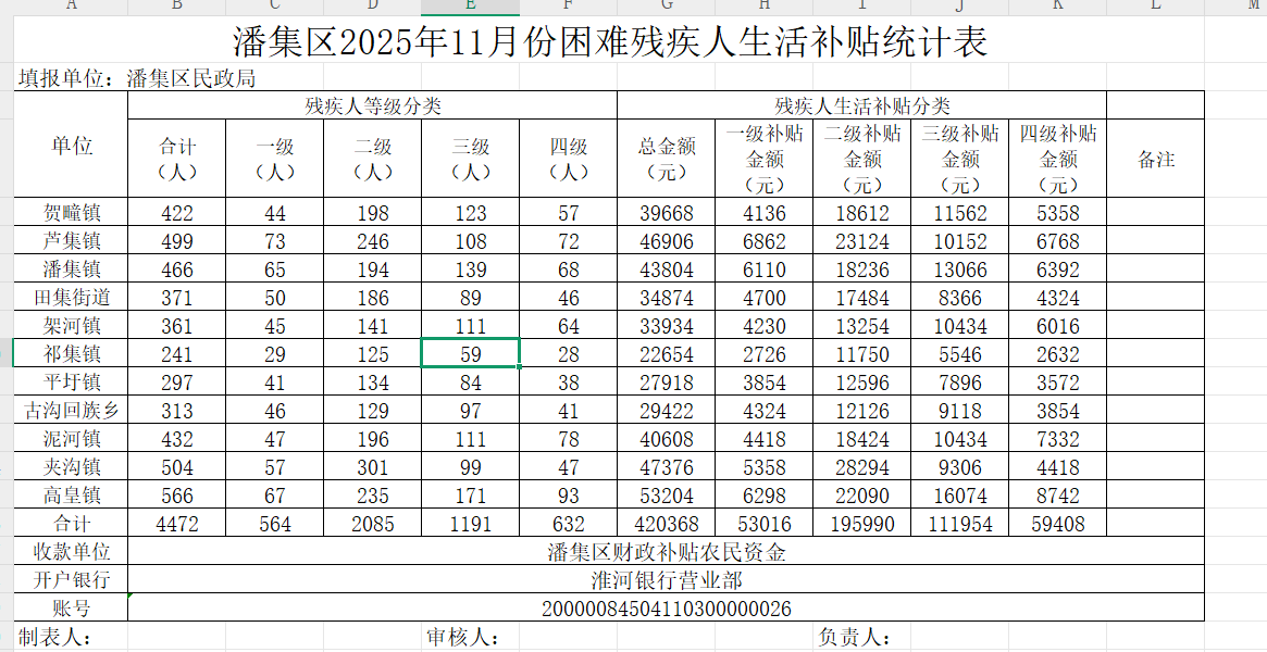 潘集区2025年11月份困难残疾人生活补贴发放审批表
