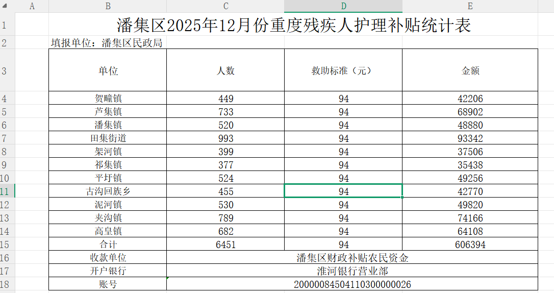 潘集区2025年12月份重度残疾人护理补贴发放审批表