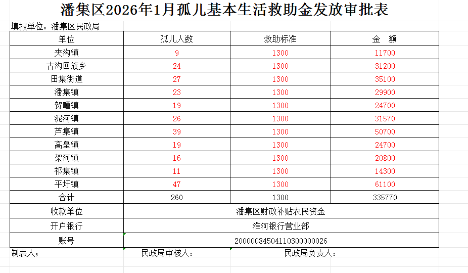 潘集区2026年1月孤儿基本生活救助金发放审批表