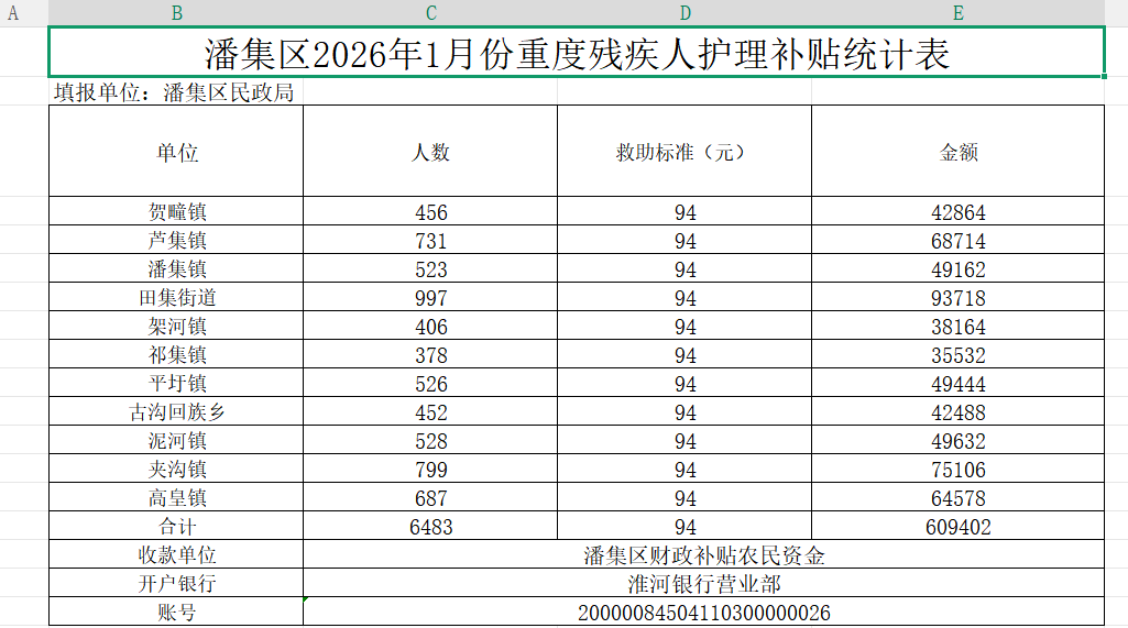 潘集区2026年1月份重度残疾人护理补贴发放审批表