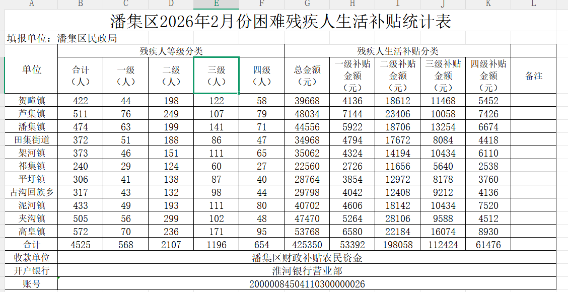 潘集区2026年2月份困难残疾人生活补贴发放审批表