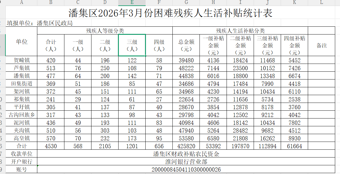潘集区2026年3月份困难残疾人生活补贴发放审批表