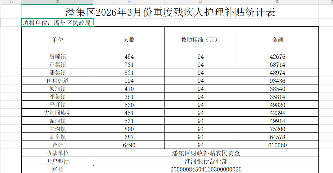 潘集区2026年3月份重度残疾人护理补贴发放审批表