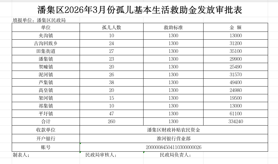 潘集区2026年3月孤儿基本生活救助金发放审批表