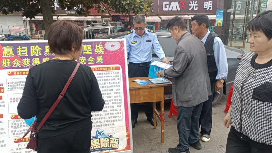 活动期间,向过往群众发放《道路安全保护条例》、《中华人民共和国民法典》、《安全生产法》及扫黑除恶等宣传单,并主动帮助群众解释条文内容。