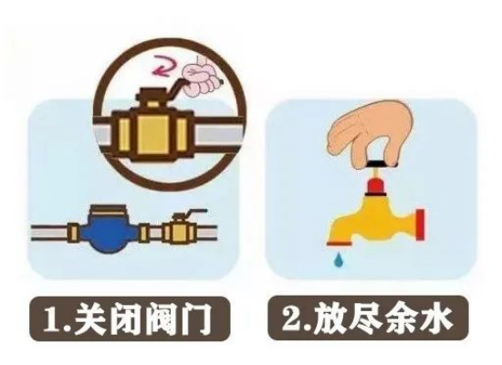 出现短时冰冻可采取的办法:对短时冰冻的水龙头、水表、水管,可用热毛巾包裹着水龙头,然后浇温水,使龙头解冻,再拧开龙头,用温水沿着龙头慢慢向管子浇洒,使水管解冻(如果是塑料的PP-R和PVC管,用户也可用电吹风烘吹)。若浇至水表处仍不见有水流出,则说明水表也冻住了,此时再用热毛巾包在水表上,用不高于30度的温水浇洒,使水表解冻,切不可用火直接烘烤或用开水急烫,以免造成管道或者水表开裂。
