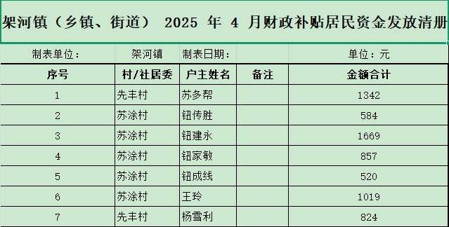 【城市低保】架河镇2025年4月财政补贴资金发放
