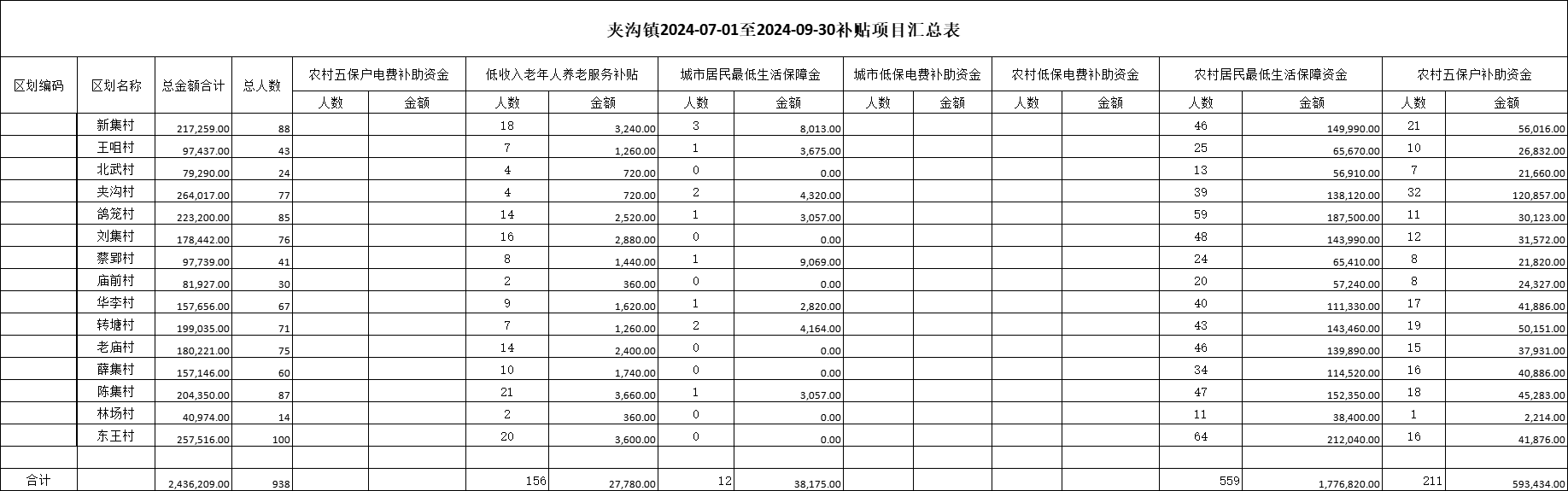 夹沟镇2024年第三季度惠民惠农补贴资金发放情况(细化到村)