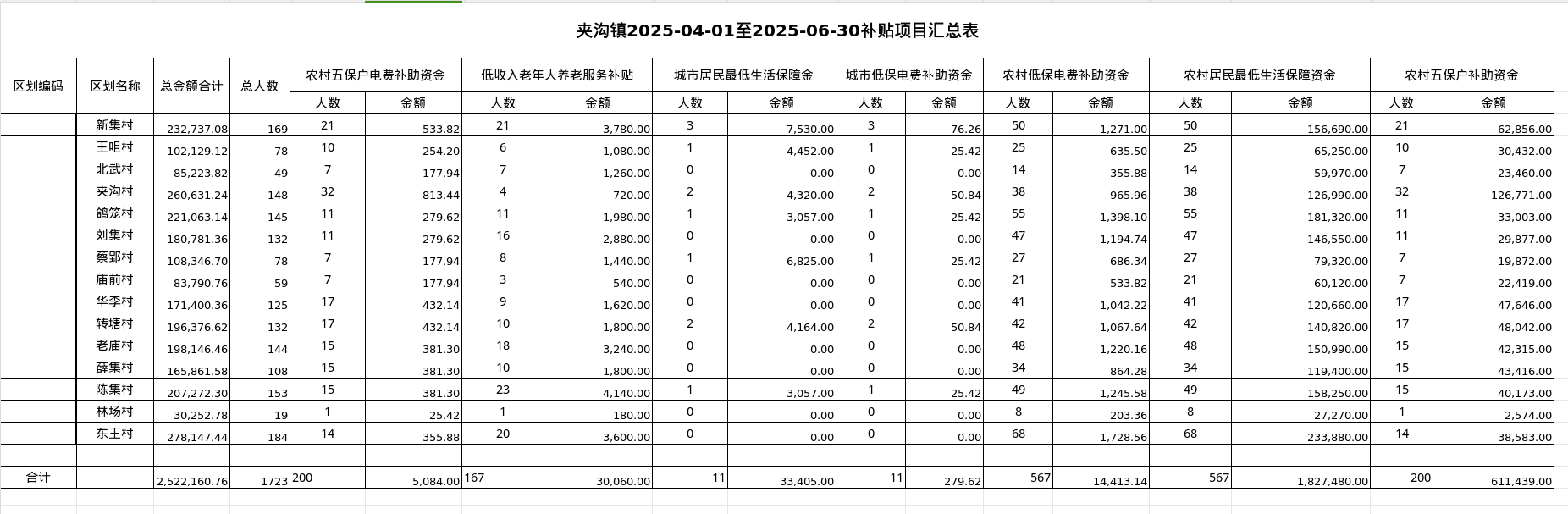 夹沟镇2025年第二季度惠民惠农补贴资金发放情况(细化到村)