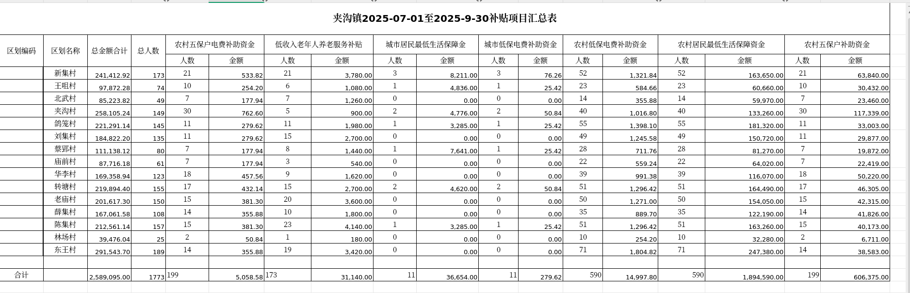 夹沟镇2025年第三季度惠民惠农补贴资金发放情况(细化到村)