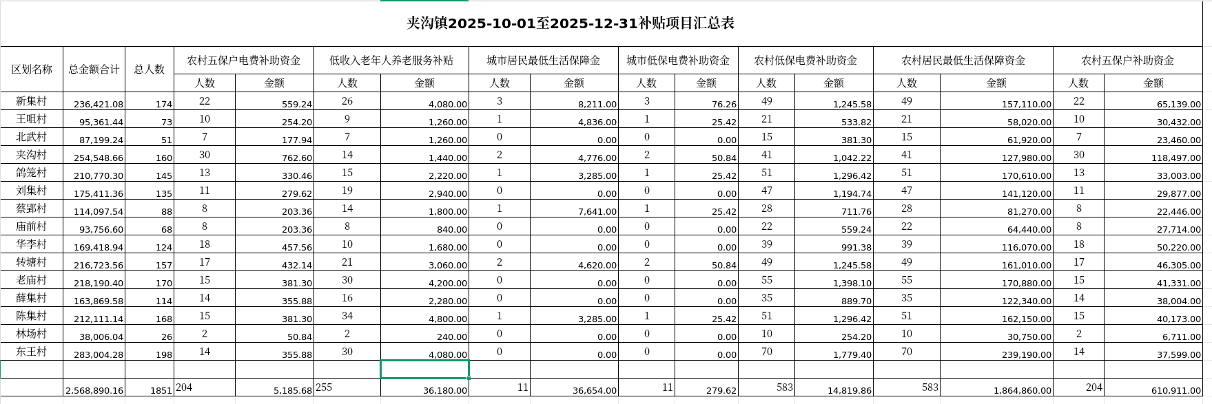夹沟镇2025年第四季度惠民惠农补贴资金发放情况(细化到村)