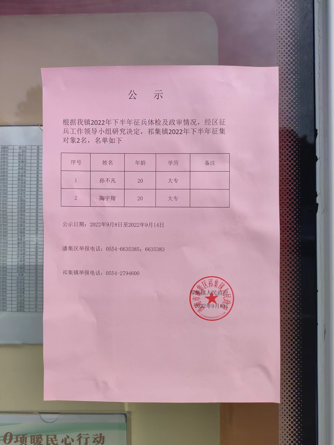 根据我镇2022年下半年征兵体检及政审情况,经区征兵工作领导小组研究决定,祁集镇2022年下半年征集对象2名,名单如下
