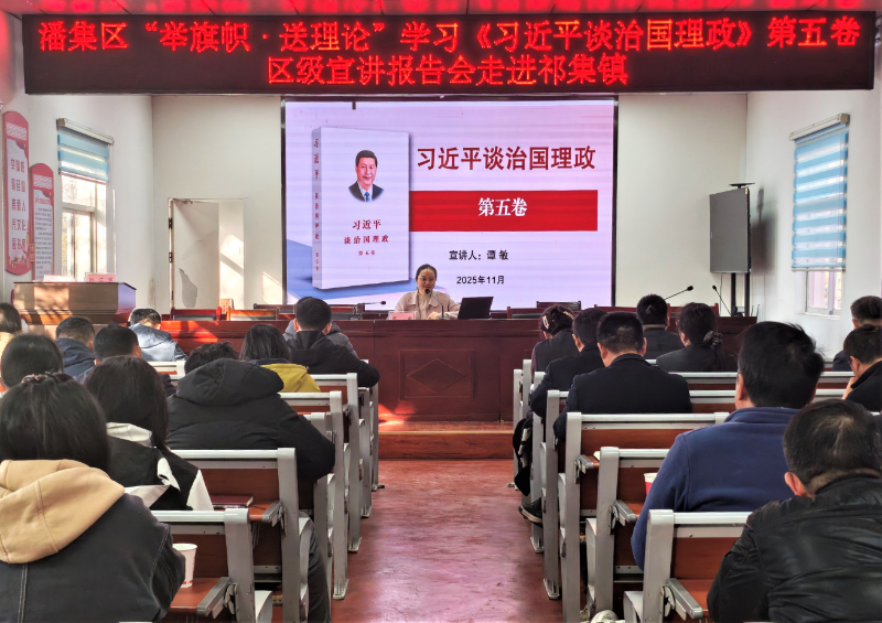 11月28日,潘集区“举旗帜·送理论”学习《习近平谈治国理政》第五卷宣讲报告会在祁集镇举行。潘集区“举旗帜·送理论”区委宣讲团成员,区融媒体中心党组成员、副主任谭敏作主题宣讲,祁集镇全体村“两委”成员参加了此次学习。